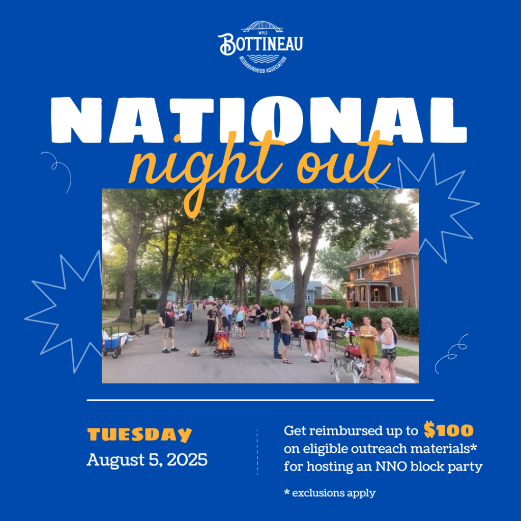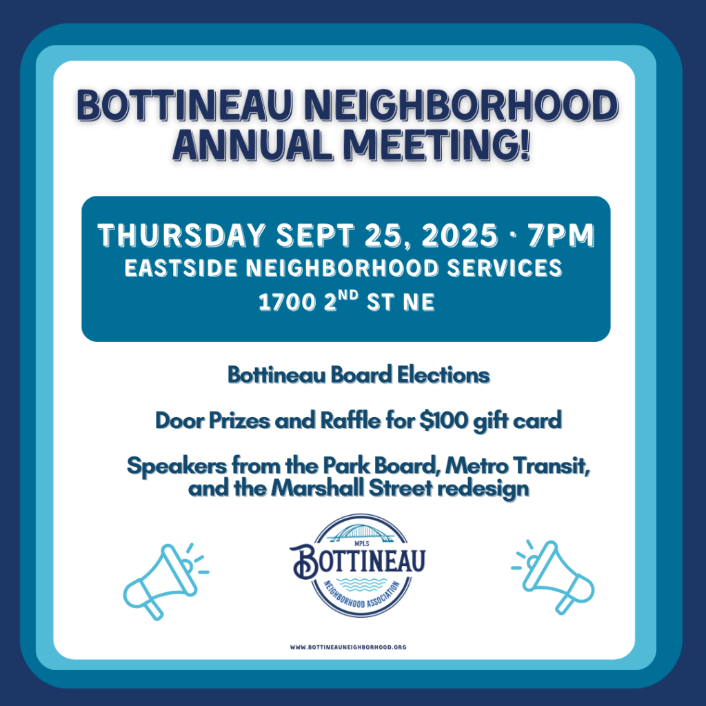 A huge thank you to everyone who made the Bottineau Annual Meeting a success! Welcome to new board members Christina Keyser and Mel Ikola, and congratulations to re-elected board members Mariam Slayhi and Alonzo Parks. We heard updates on Bottineau Park, Metro Transit routes, Minneapolis Police Department policies, plans for Marshall Street Reconstruction, and learned about the Mississippi Watershed Organization! We’re so grateful for the engagement of our neighbors, the insights from our speakers, and the hard work of our board volunteers.