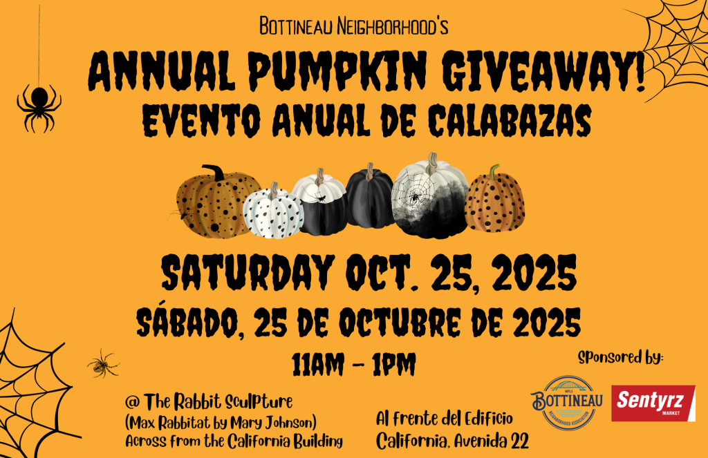 Annual Pumpkin Giveaway Saturday October 25, 11am – 1pm! At the California Street Farm, across from the California Building