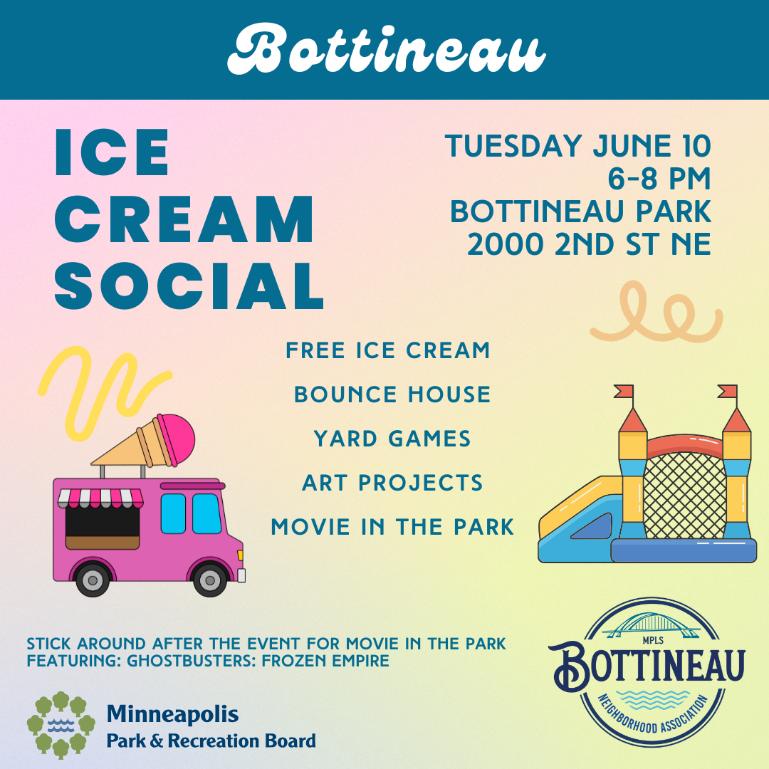 Join the Bottineau Neighborhood Association at the annual Ice Cream Social on Tuesday, June 10th, from 6 PM to 8 PM at Bottineau Park (2000 2nd St NE).
