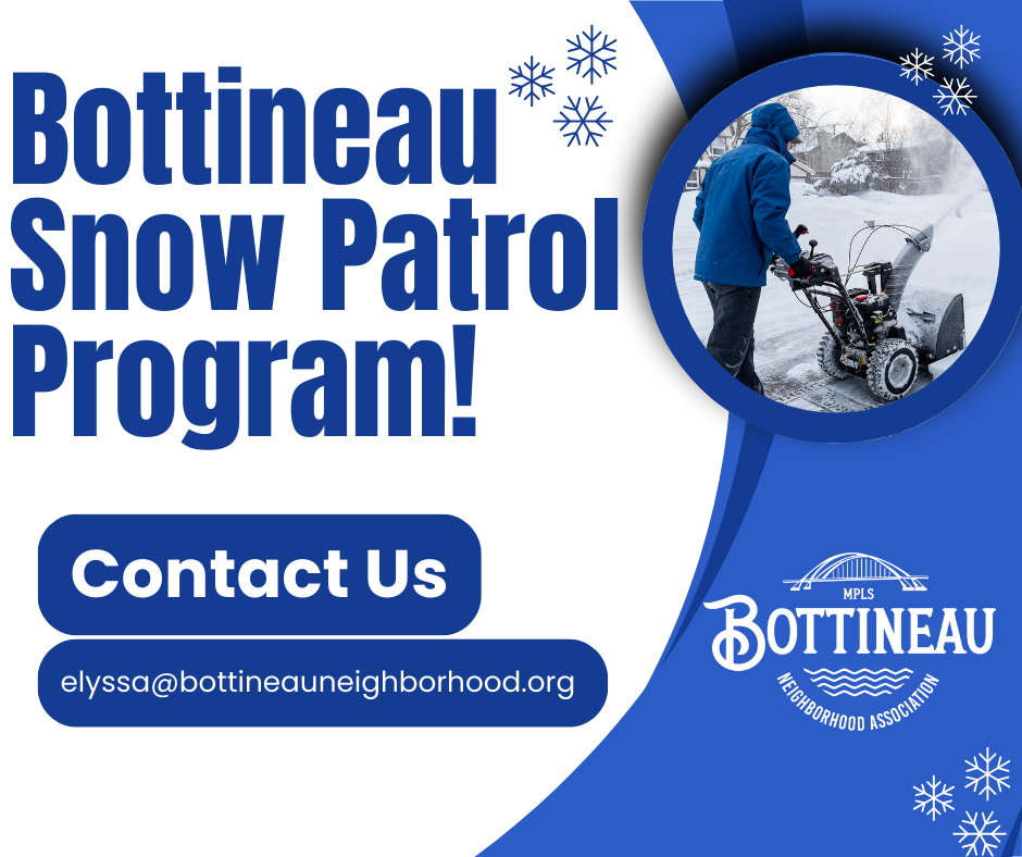 The Bottineau Neighborhood Association (BNA) is excited to launch the Neighborhood Snow Patrol Pilot Program this winter! This program provides a free, community-driven solution for snow and ice management on sidewalks, enhancing public safety and accessibility in the Bottineau neighborhood.